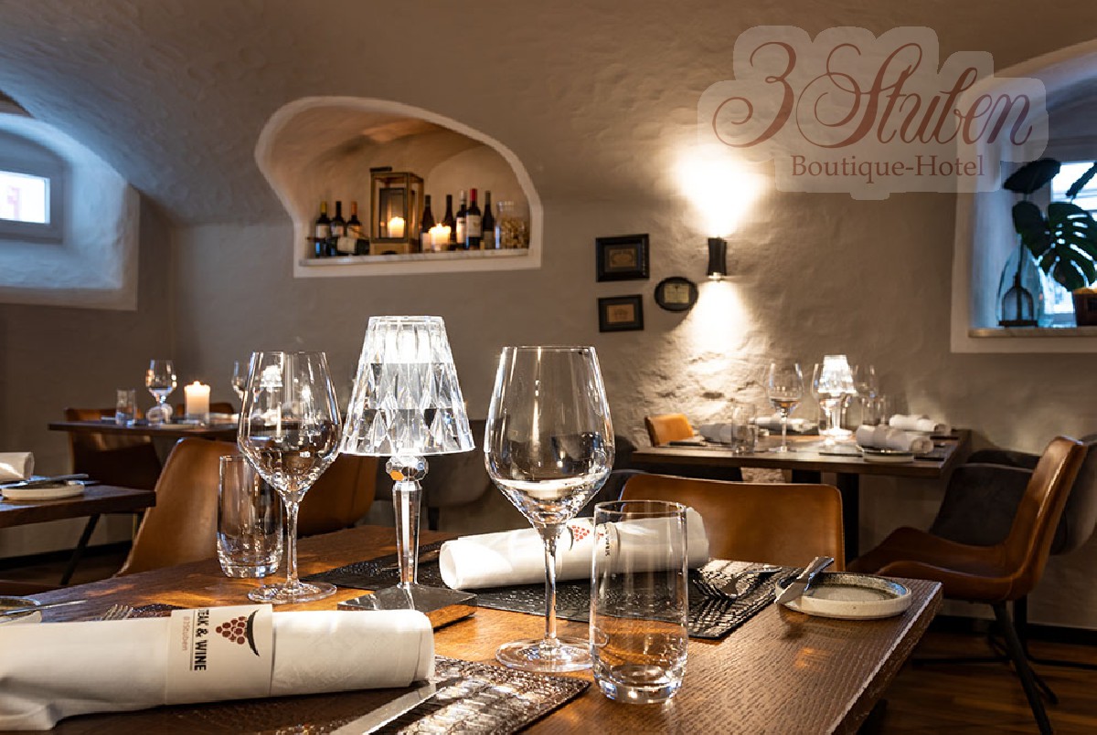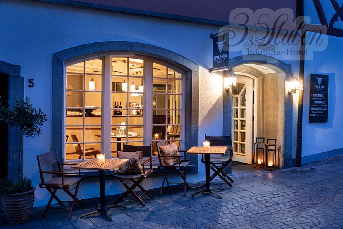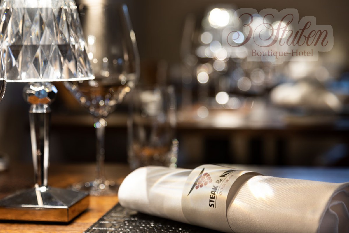 In unserem Steak & Wine servieren wir Ihnen eine Auswahl an Steak-Klassikern, z.B. Dry aged Porterhousesteak 500g, Rumpsteak mit 200g/300g, Filetsteak 150g/200g/300g, Tomahawk Steak 1100g oder Dry aged Rib Eye Steak 300g. Kombinieren Sie aus unseren Beilagen wie z.B. Grillgemüse, Stangenbohnen, Trüffel-Pommes und vielem mehr nach belieben. Alternativ zu Fleisch bieten wir Ihnen auch Fisch oder vegetarische Speisen an.